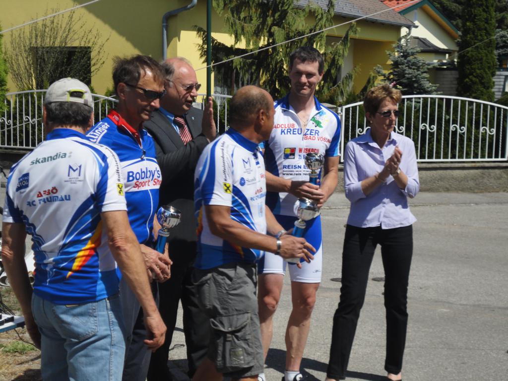 Sofort nach dem Startschuss wurde das Tempo enorm in die Höhe getrieben und nach bereits einer Runde konnte ich mich mit weiteren drei Fahrern absetzen. Leider erwischte Florian ein "langsames" Hinterrad und die Lücke konnte nicht mehr geschlossen werden. Da meine 3 Mitausreißer allesamt in der "Jungen" AK fuhren, war die Situation für mich "alten Hasen" sehr beruhigend. Um vor Langeweile nicht einzuschlafen und vom Rad zu fallen entschloss ich mich für eine aktive Fahrweise. Das ist mir insofern gelungen, als ich bei 4 Sprintwertungen jeweils als Zweiter über den Strich fuhr. Der riskanten und verwegenen Kurvenfahrten des fünfmaligen Sprintsiegers wollte und konnte ich nichts entgegensetzen. In der letzten Wertung fuhren wir auf die verbliebene Hauptgruppe auf (Überrundung). Nachdem mein zweiter Gesamtrang und mein Sieg in der AK2 eingebracht waren, rollte ich in der finalen Runde einfach nur an vierter Stelle ins Ziel.