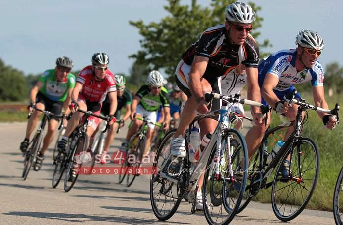 Gleich zu Beginn gingen 2 Fahrer weg, wobei einer gleich wieder gestellt wurde. Die erste Runde wurde zügig gefahren und ich habe mich immer so um die 20 Stelle im Feld platziert, immer mit dem Blick nach vorne, wo sich immer Georg so um den 6 Platz aufhielt. Am Ende der ersten Runde reihte ich mich sicherheitshalber vorne ein und kam überraschender Weise recht gut über den „Zielhügel". Bei der Zieldurchfahrt erfuhren wir durch den Platzsprecher, dass ein Fahrer immer noch draußen ist und 2 min Vorsprung hat. Dann wurde schnell gefahren, Georg und ich immer so an 5-6 Stelle. Leider konnten wir den Ausreißer nicht stellen und so wurde das Tempo komplett herausgenommen. Kurz vor dem Ziel ging's dann wieder richtig los (siehe Foto). Ich positionierte mich so um den 10 Platz. Bei der Einfahrt nach dem Kreisverkehr in Langenlois, kurz vor der Bergaufpassage, bogen wir rechts ab und ich sah nur mehr einen schwarzen BMW vor mir. Rechtsausweichen ging nicht mehr und als Kühlerfigur fühlte ich mich Feminin genug, so beschloss ich links im Schritttempo und Lenkerbreite vorbeizufahren. Nach Austausch von Freundlichkeiten und eine Menge Wut im Bauch versuchte ich der Spitze nachzufahren, konnte noch ein paar Fahrer abfangen und belegte am Ende Platz 11 in der Ü35. Schnitt 40,6km/h.