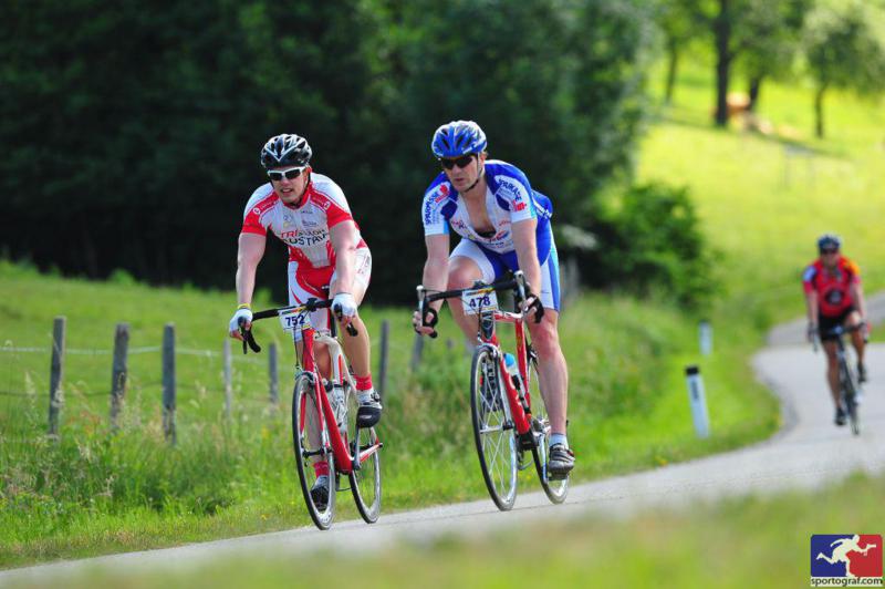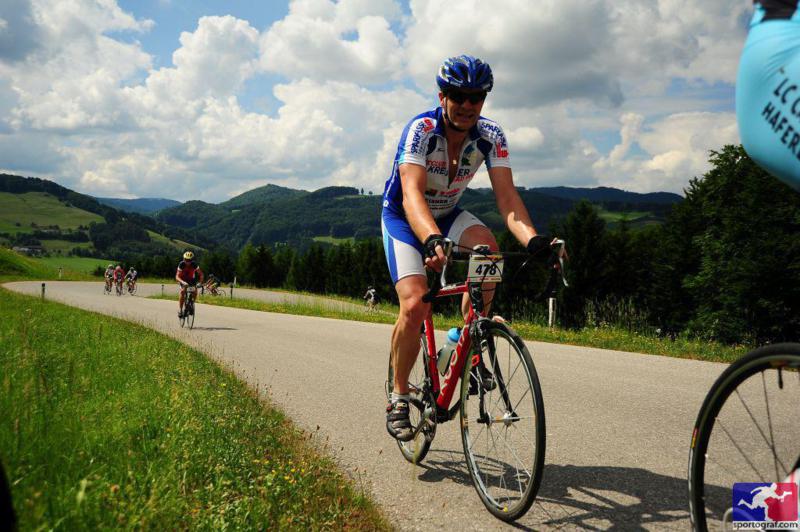 Kurz einfahren, dann zogen schon die ersten dunklen Wolken auf. Obwohl ich 25 Minuten vor dem Start Aufstellung bezog, stand ich schon im letzten Drittel. Als der Startschuß fiel, hieß es Positionen gut machen. Nach 5km dann vor mir ein Massensturz. Ein parkendes Auto auf dem rechten Fahrbahnrand genügte, und die Reihe vor mir legte sich auf den Asphalt. Mit dem Instinkt von 30 Rennjahren ahnte ich so etwas und konnte mit einem gekonnten Sprung auf den Gehsteig ausweichen. Nun hetzten wir zu zweit dem Feld nach, das wir auch einholten. Allerdings handelte es sich um abgerissene Gruppen. Schade, dass sich die Teilnehmer nicht nach ihrer tatsächlichen Leistungsfähigkeit aufstellen. Immerhin fand ich dann doch eine größere Gruppe, mit der es auch mit viel Tempo in den ersten Anstieg ging, wo ich zwei Klubkameraden traf. Dann leider ein technischer Defekt. Ich spürte ein "Rumpeln" der Kette und musste den Druck vom Pedal nehmen. Die Kette war im Begriff der Auflösung - und das bei KM 35. Schade, ich war gut drauf! Nun hieß es "finishen". Behutsam und gleichmäßig kurbelte ich weiter, in der Hoffnung, die lädierte Kette so gering wie möglich zu belasten. Trotzdem konnte ich am letzten Anstieg noch viele Teilnehmer überholen und wieder mit einer größeren Gruppe die letzten KM ins Ziel fahren. Schade wegen dem Defekt - eine Top 10 Platzierung wäre sonst sicherlich möglich gewesen.